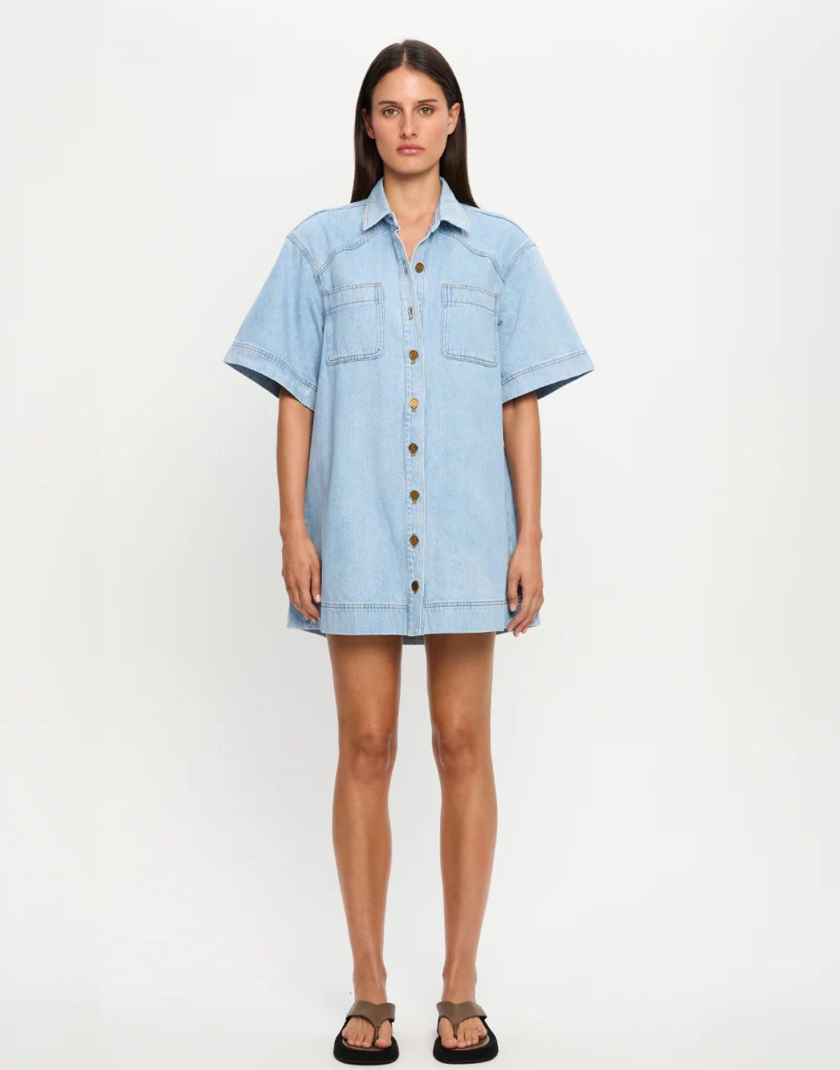 The Avery Denim Dress in light blue is an oversized fit featuring a button down front, back pleat detailing and complete with patch pockets.
