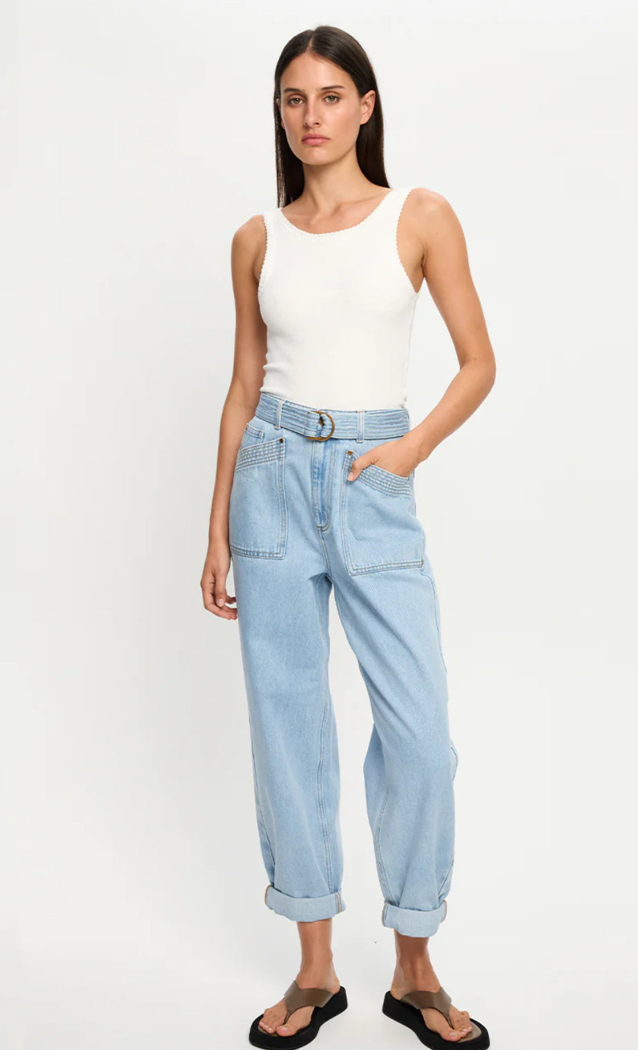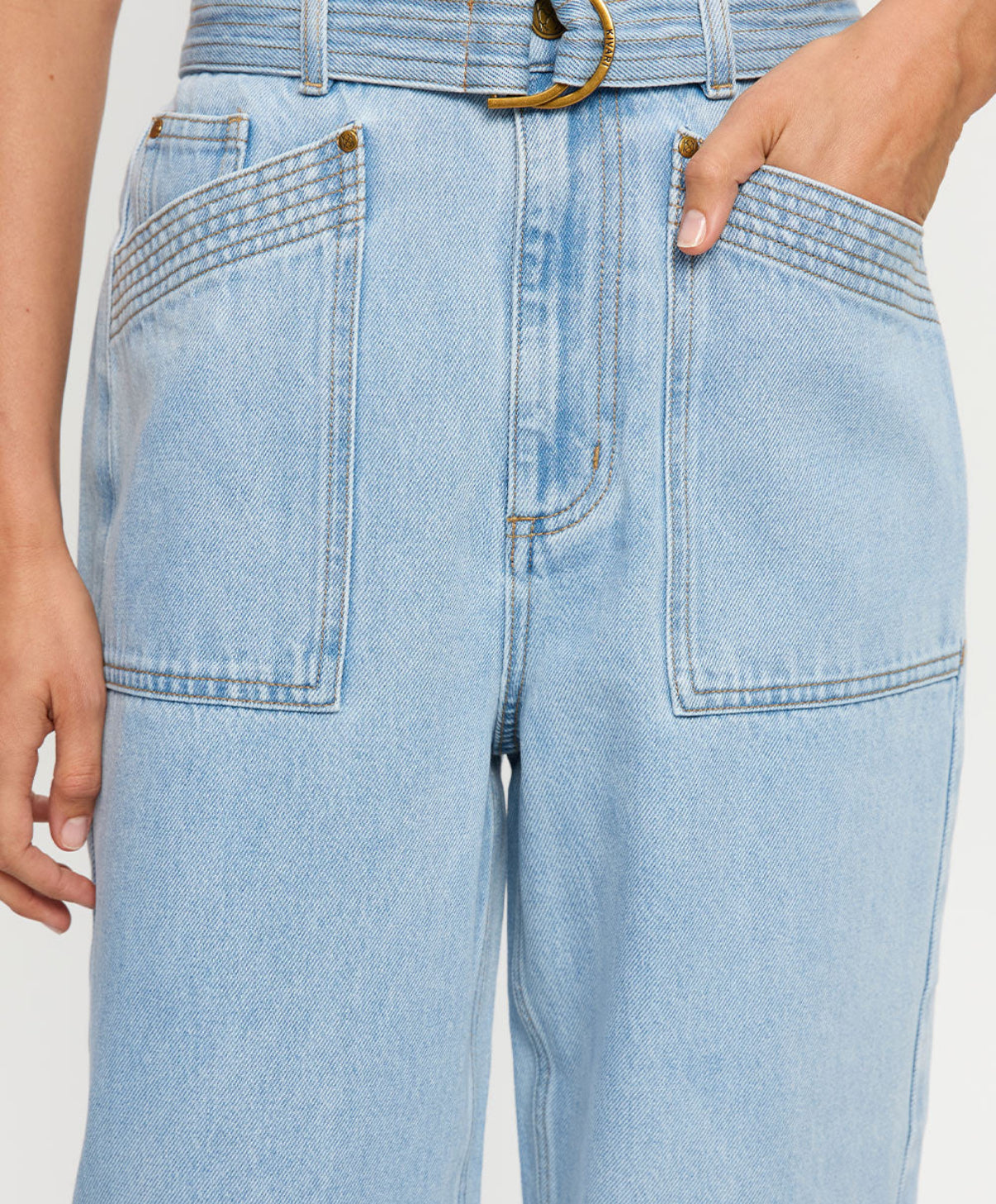 The Stevie Denim Jean in light blue has a relaxed crotch and tapered leg shape, featuring top-stitch detailing, front and back pockets, complete with a signature gold D-Ring belt
