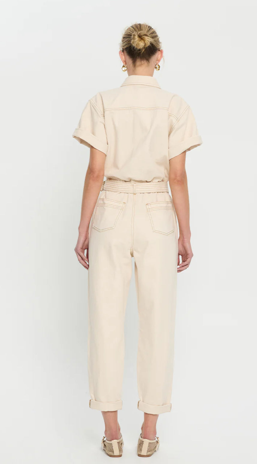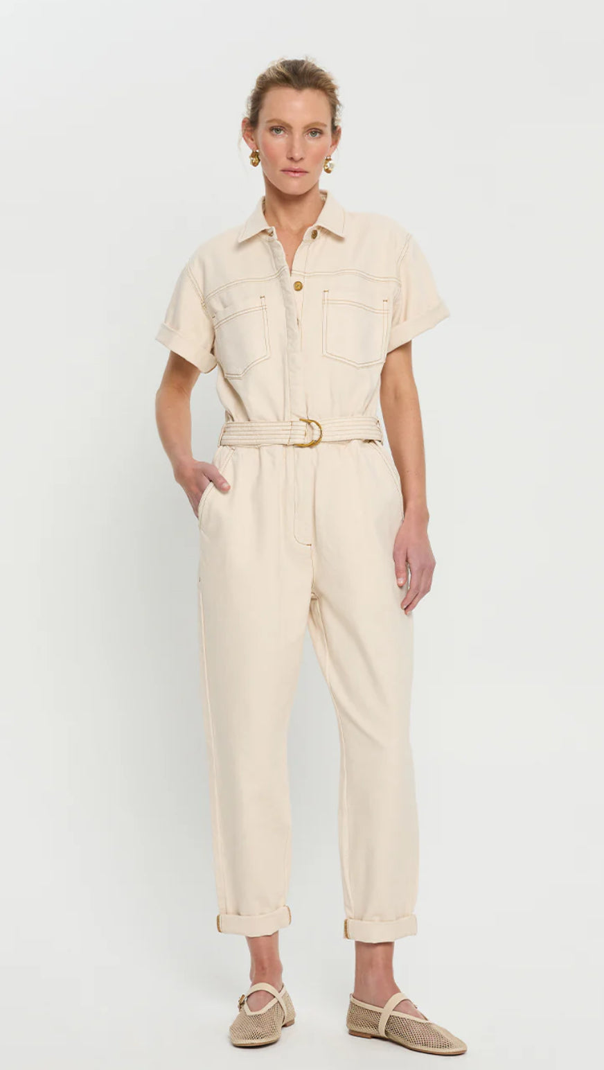 The Tahlia Boilersuit in cream is designed with a slim bodice, short sleeves and a straight leg and features a d-ring belt, patch pockets, complete with signature gold hardware.