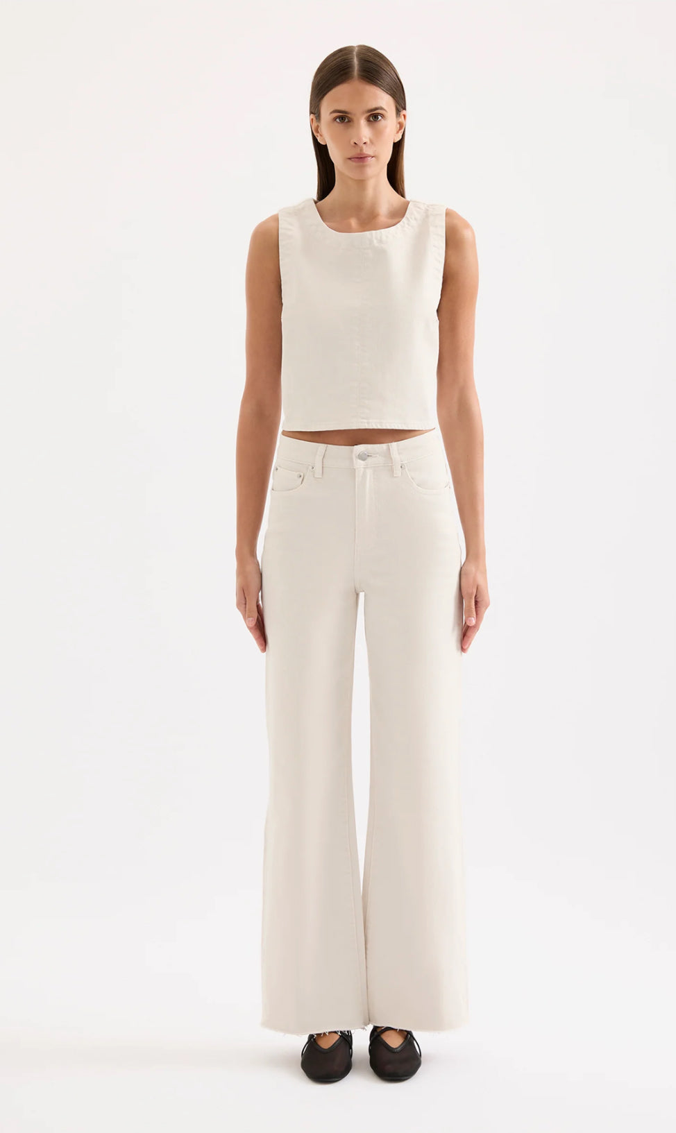 The Cali Denim Top is made from a stretch organic cotton denim that has been washed to a stone wash Dune. The silhouette is a clean, casual cropped fit which finishes on the waist. Features include a round, crew neckline and button opening at centre back.