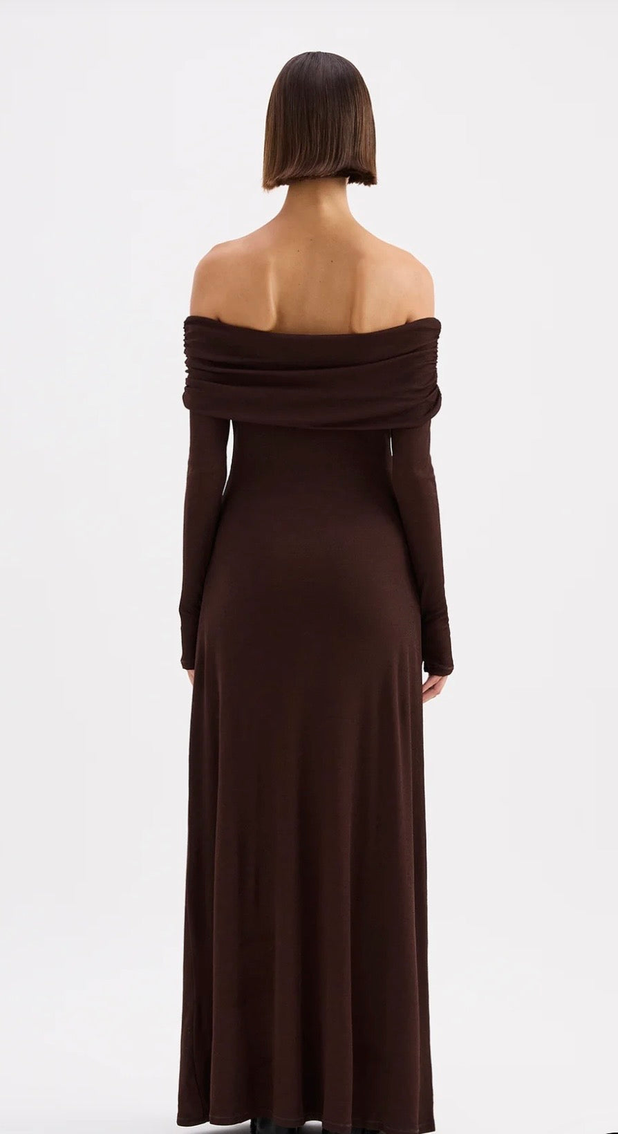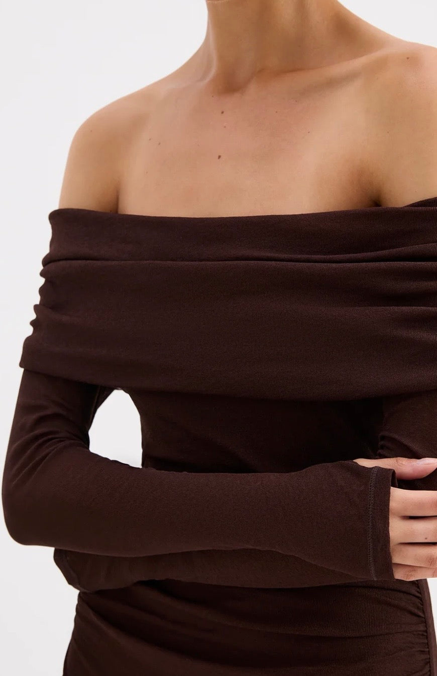 The Rue Mesh Long Sleeve Dress is designed from a stretch jersey fabrication that has a dry, lightweight hand feel to provide a comfortable fit. This long sleeve dress is off the shoulder and has a maxi length silhouette. Features include a fold over neckline, draping through body and across bust and thumb holes. This dress is fully lined.