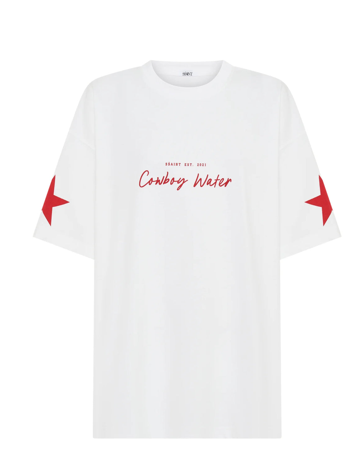 Embrace the Wild West with the Cowboy Water Tee. Inspired by our bestselling fragrance, this unisex tee features a bold white and red Cowboy Water logo, stars on the sleeves, and the embroidered slogan "Keep Hydrated in the Wild West" stitched in vibrant red on the collar. Rugged, stylish, and effortlessly iconic.