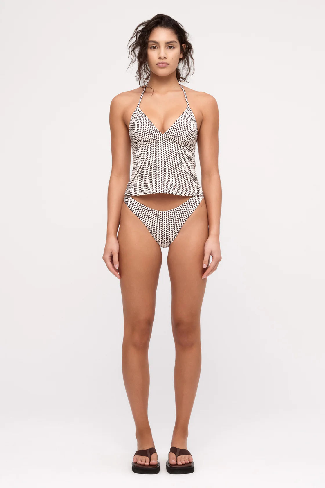 A curved waist bikini brief made from a buttery soft fabric in a spot print. Featuring self-fabric lining in a reversed colourway, it can be worn two ways. Designed to flatter the figure, it elongates the leg and creates shape through the hip.